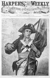 Obraz: '76' Minuteman or Continental Soldier holding a musket flag, front cover of 'Harpers Weekly, A Journal of Civilization', engraved by Speer, New York, July 15th, 1876 (engraving) (b/w photo) / Maynard George Willoughby | Umenie Sveta – Obrazy, predaj obrazov